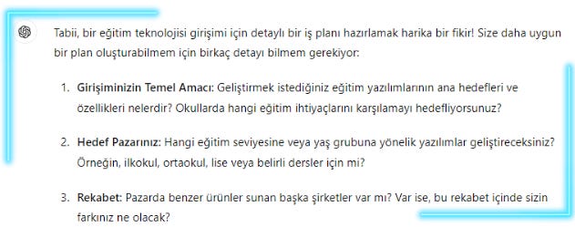 “Okullar için eğitim yazılımları geliştirmeye odaklanan bir teknoloji girişimi için detaylı bir iş planı yazar mısın? Bu görevi yerine getirmeden önce, bilmen gereken detaylar varsa sor.”