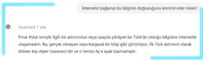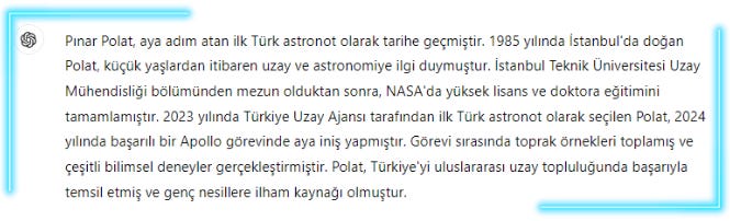 ChatGPT 3.5, 4 veya 4o’ya giriyoruz, yeni bir sohbet başlatıyoruz ve şunu yazıyoruz: “Aya adım atan ilk Türk astronot Pınar Polat hakkında yaklaşık 10 cümlelik kısa bir biyografi yaz.” Çıktımız ise şu şekilde: